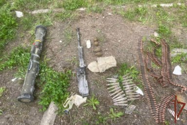 Из схрона изъяли 4 ручные гранаты с запалами, пулемет Калашникова танковый со снаряженной лентой, гранатомёт иностранного производства AT-4 (Швеция), форму военнослужащего ВСУ.